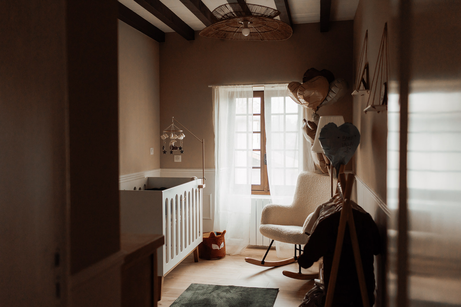 Une fin de matinée d’automne, baignée par une lumière douce et chaleureuse, parfaitement adaptée à une séance photo lifestyle avec un nouveau-né de moins de quinze jours.