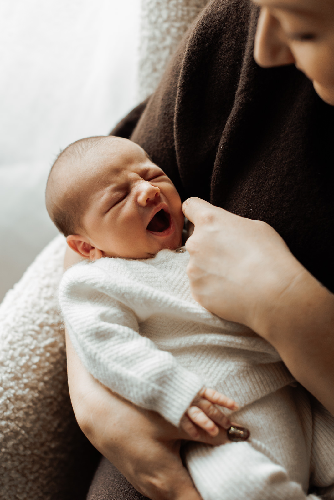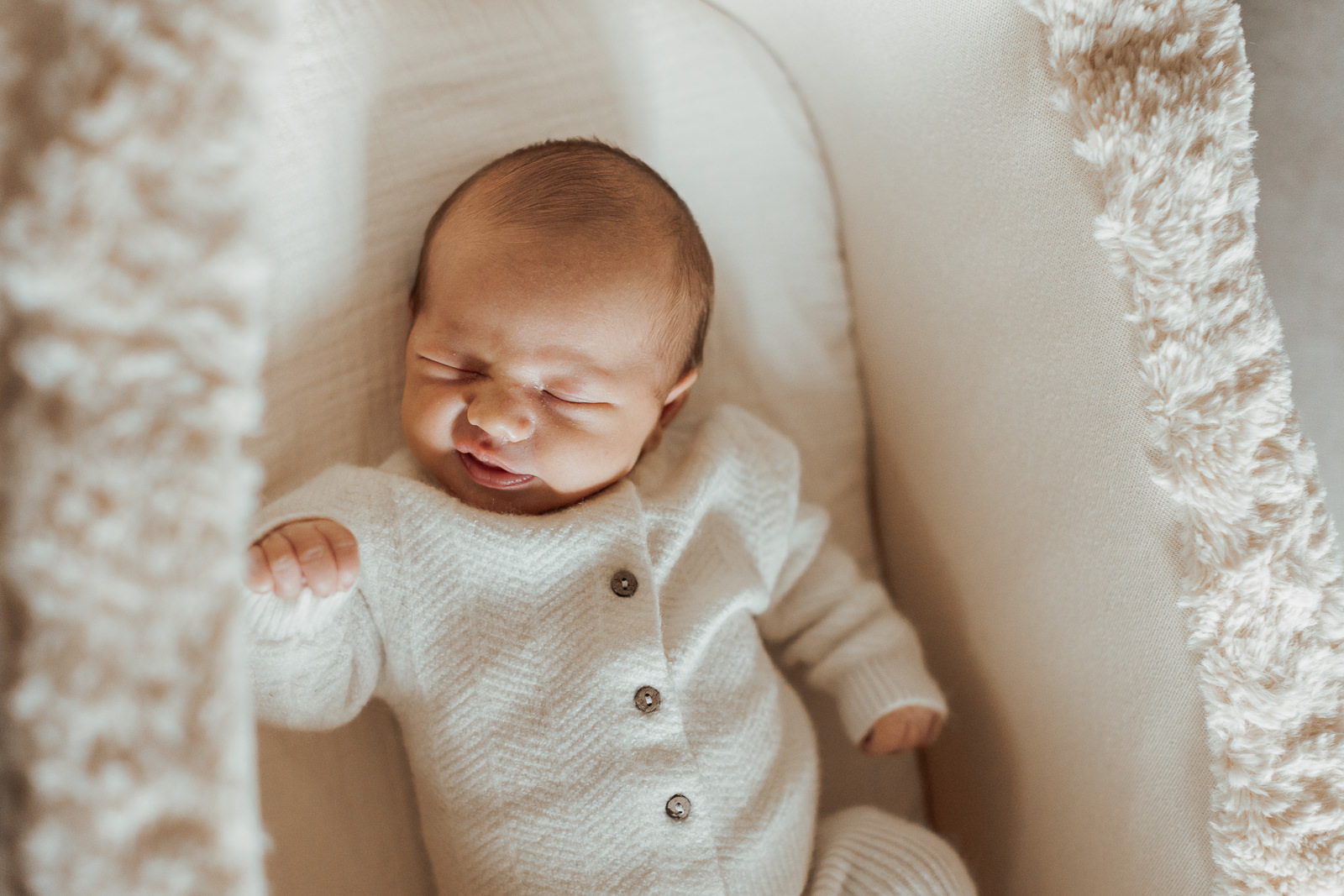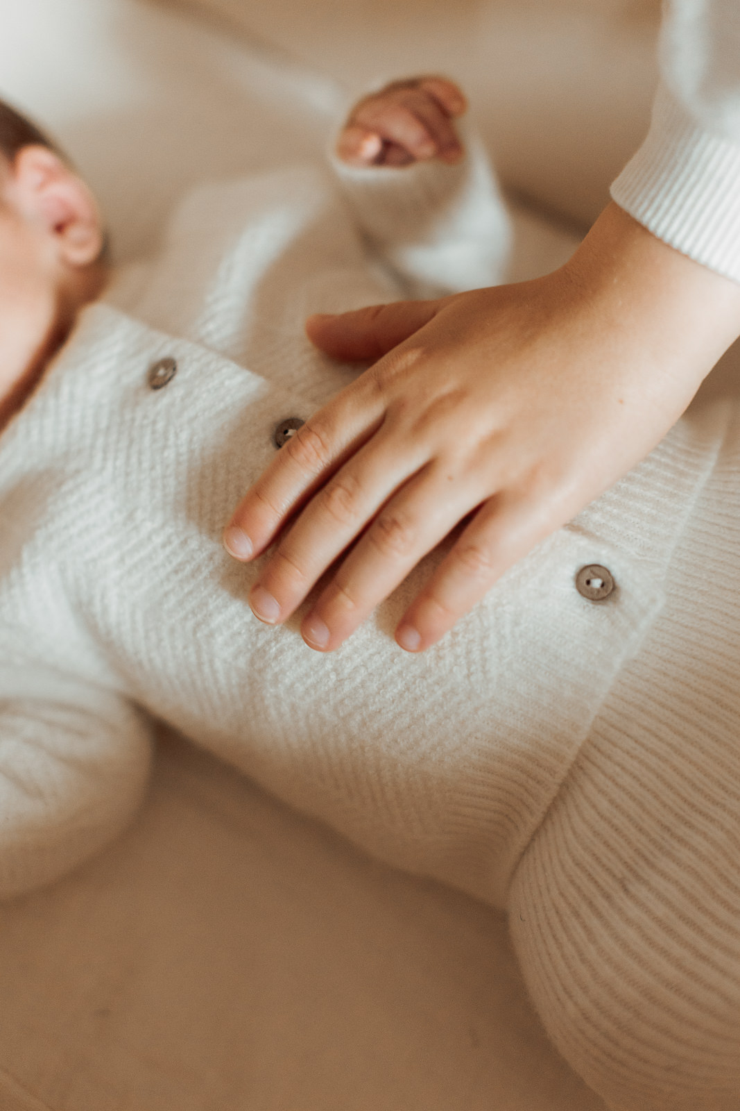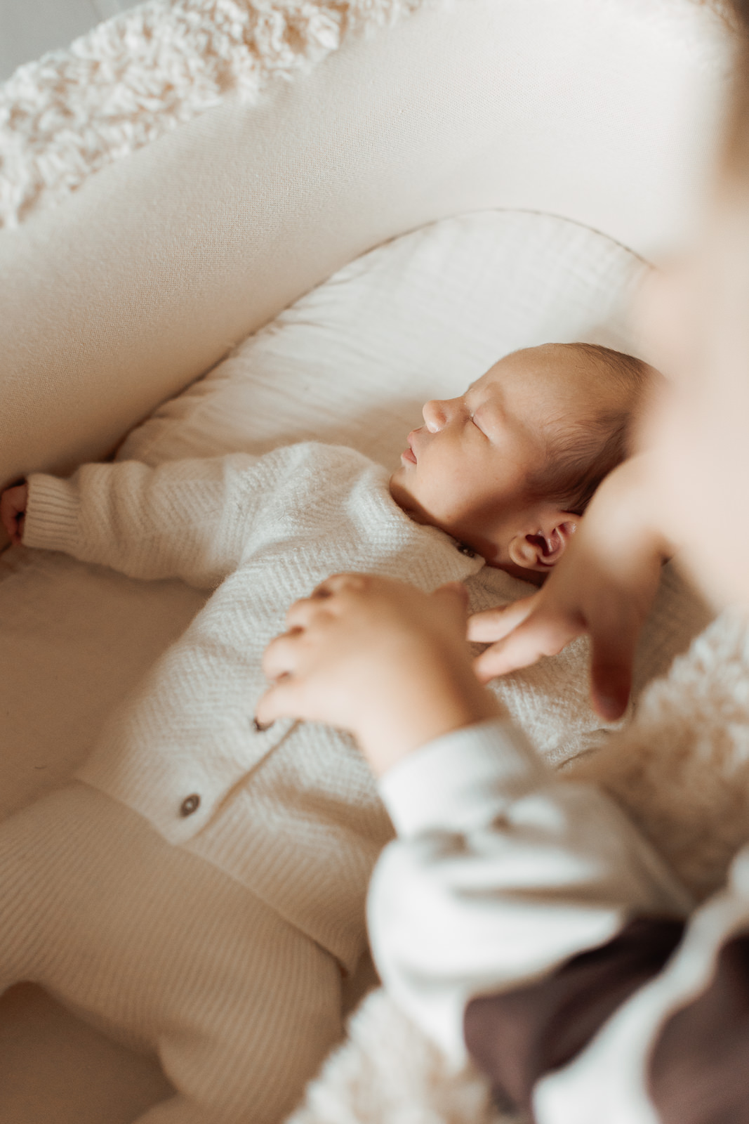 Les matières naturelles ( laine, coton, mailles…) ajoutaient une dimension encore plus cocooning aux photos. C’est un choix que je recommande souvent dans mes séances photo nouveau-né, car il s’accorde très bien avec les tons doux et naturels de mon style.