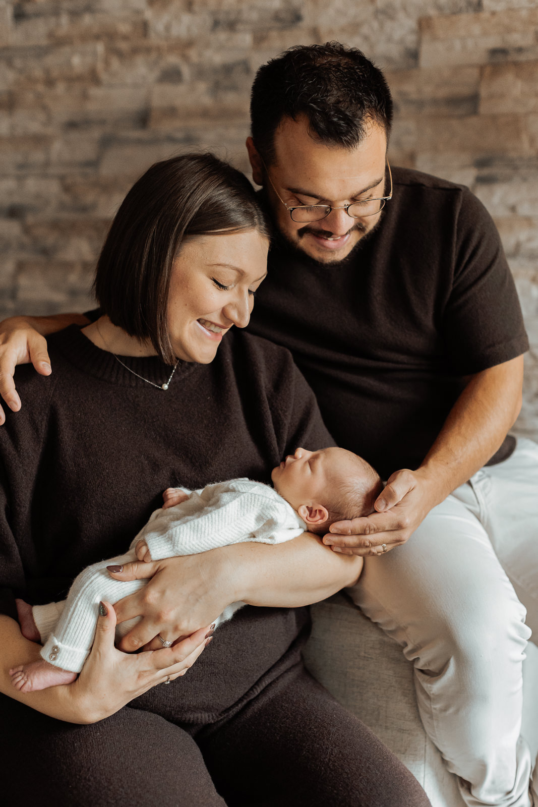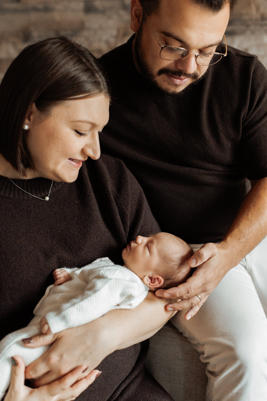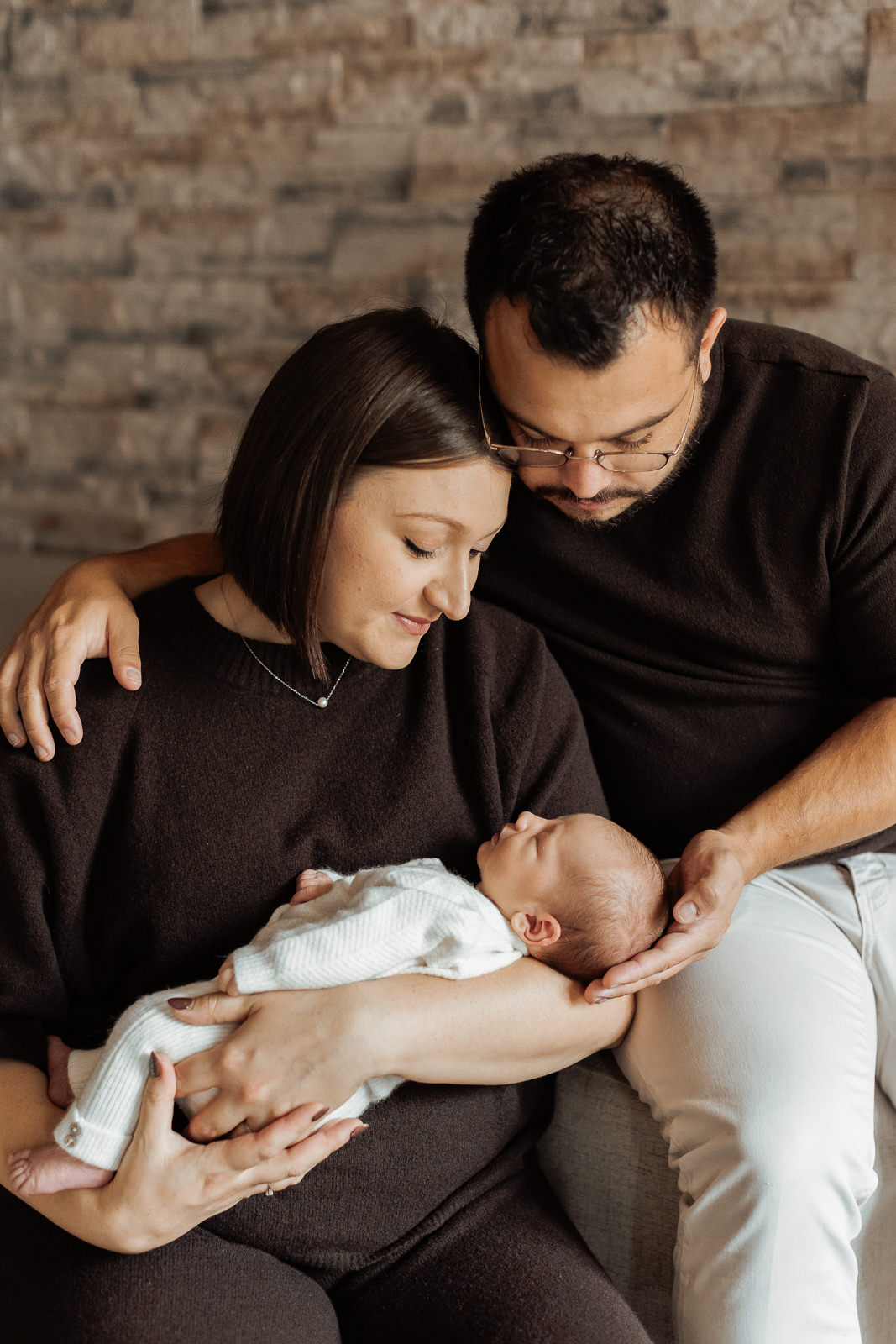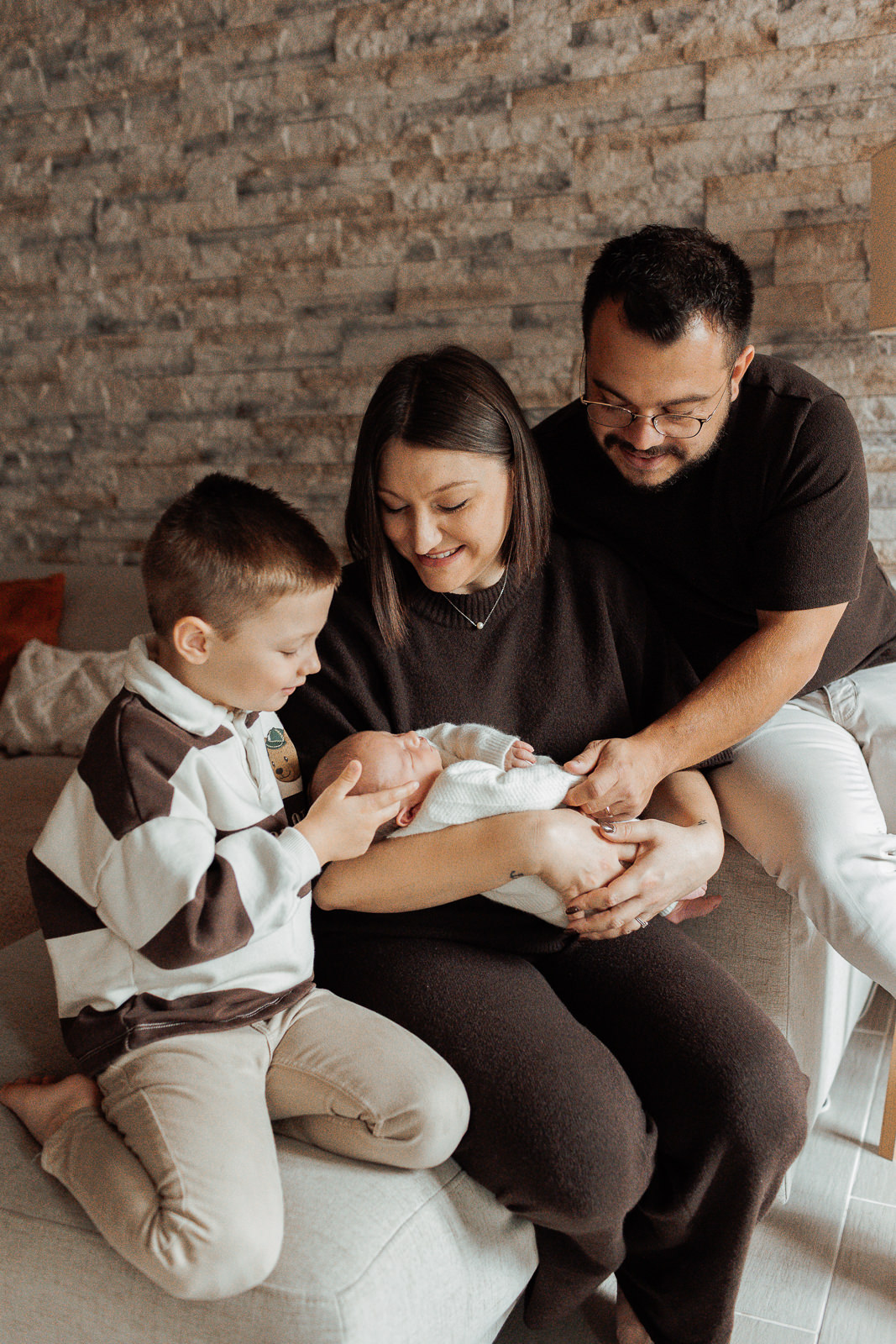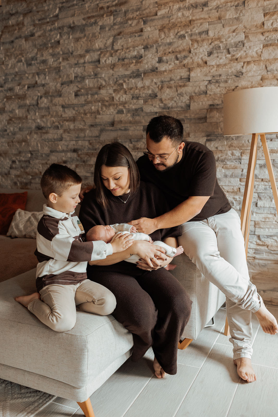 Cette famille portait des tenues hivernales dans des teintes marron, nude et laineuses. Ces couleurs neutres créaient une harmonie visuelle parfaite, renforçant l’ambiance douce et chaleureuse de la séance.