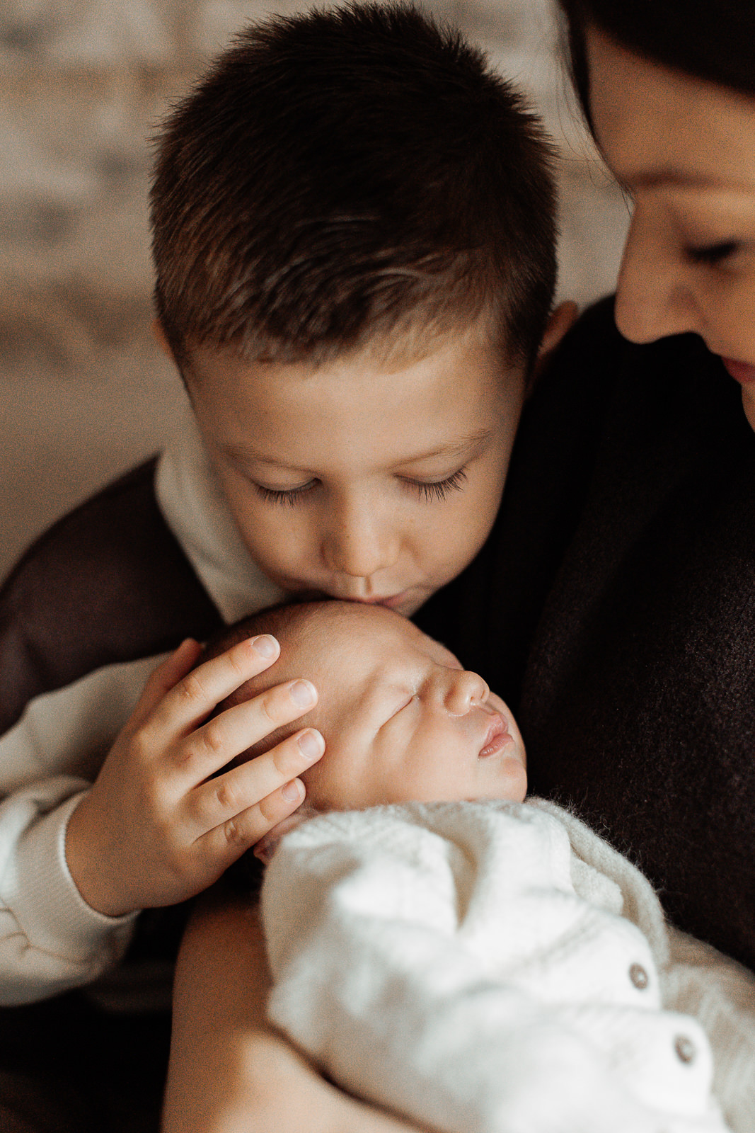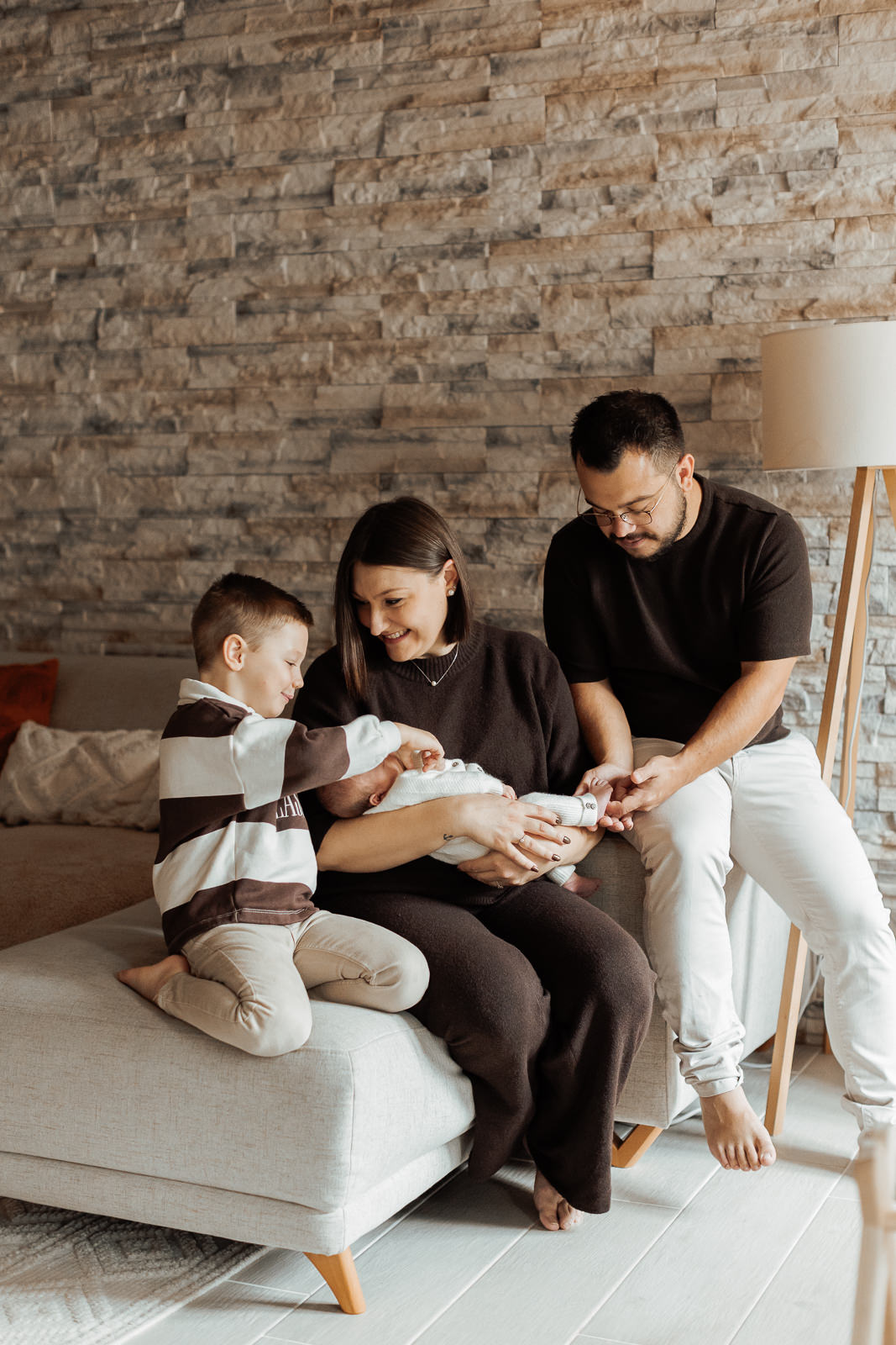 La lumière de fin de matinée, filtrée par les fenêtres, dessinait de doux contrastes qui mettaient en valeur la peau du bébé, les expressions du grand frère et les gestes tendres des parents.