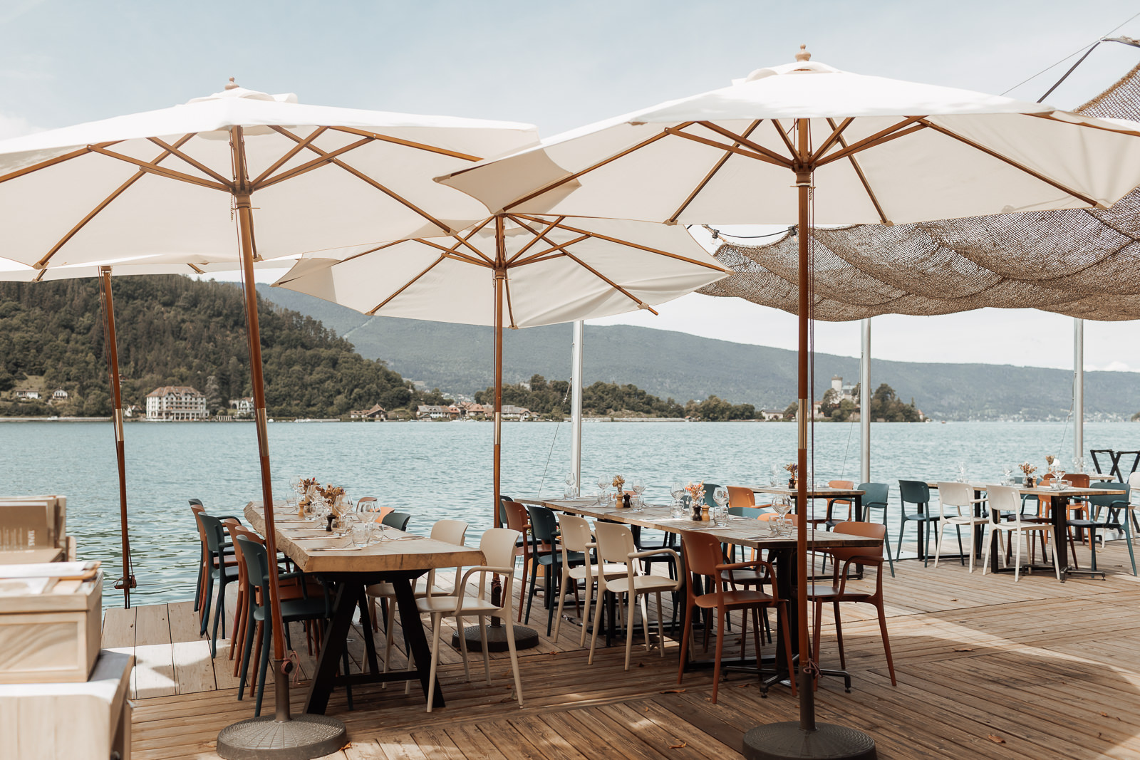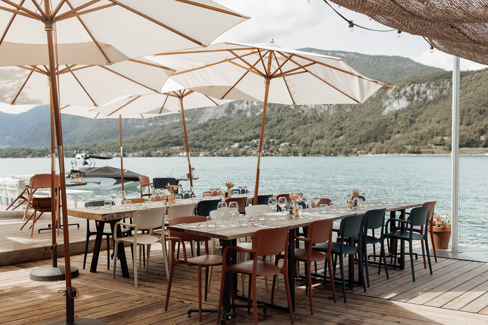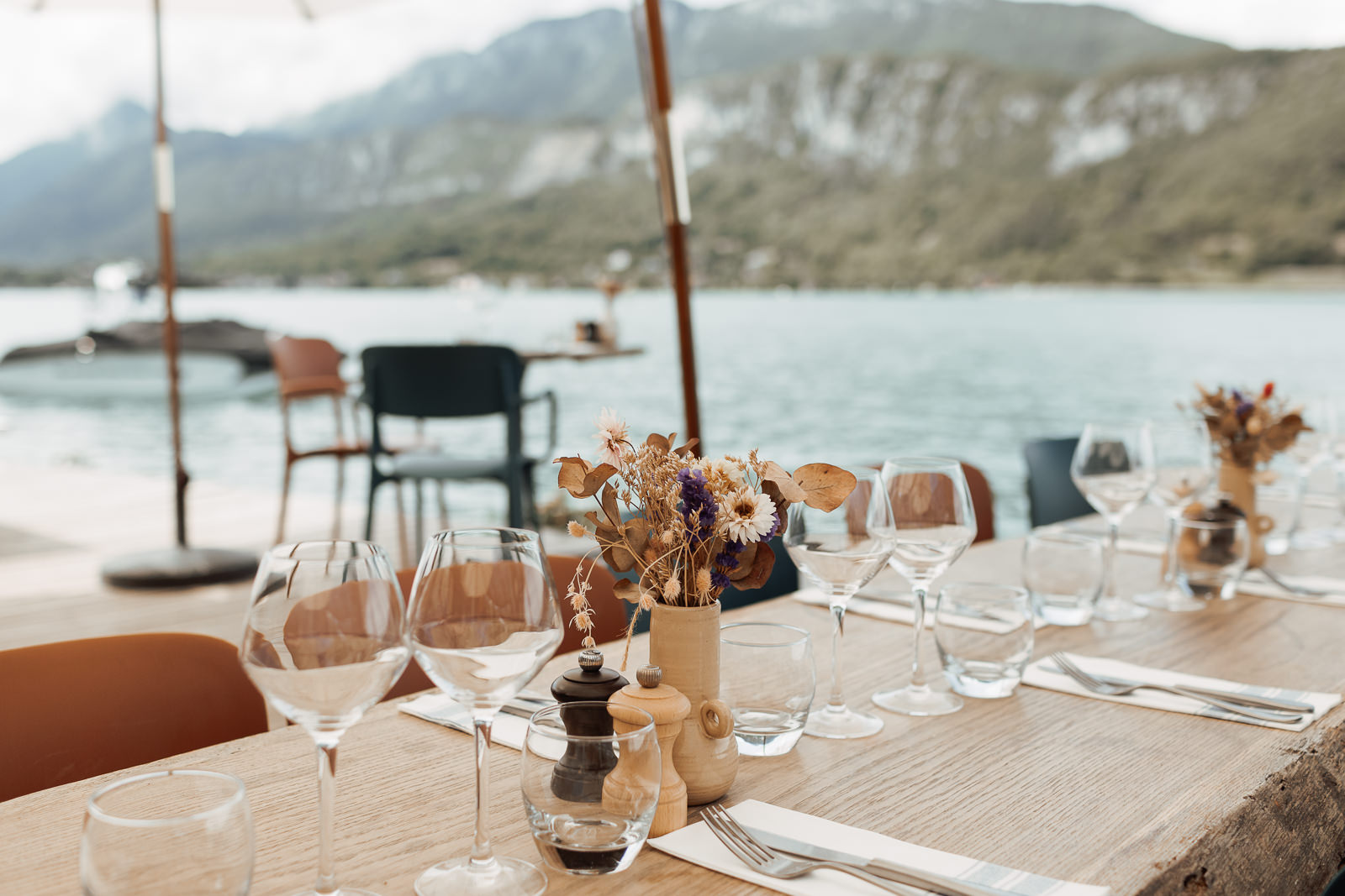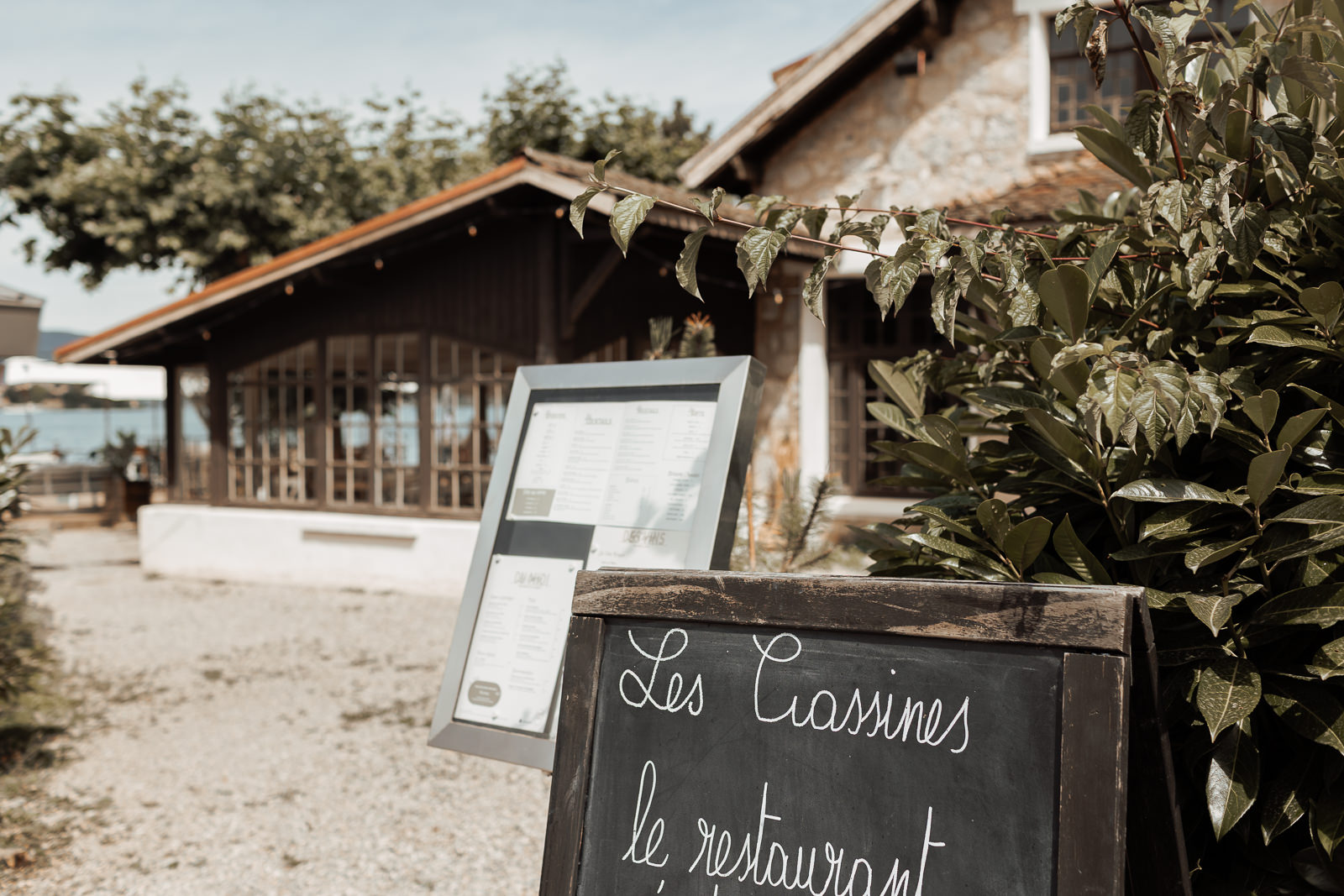 Le restaurant Les Cassines, moderne et chaleureux, est idéal pour accueillir les proches après la cérémonie. Sa terrasse ouverte et sa proximité immédiate avec le lac offrent un décor naturel incroyable.