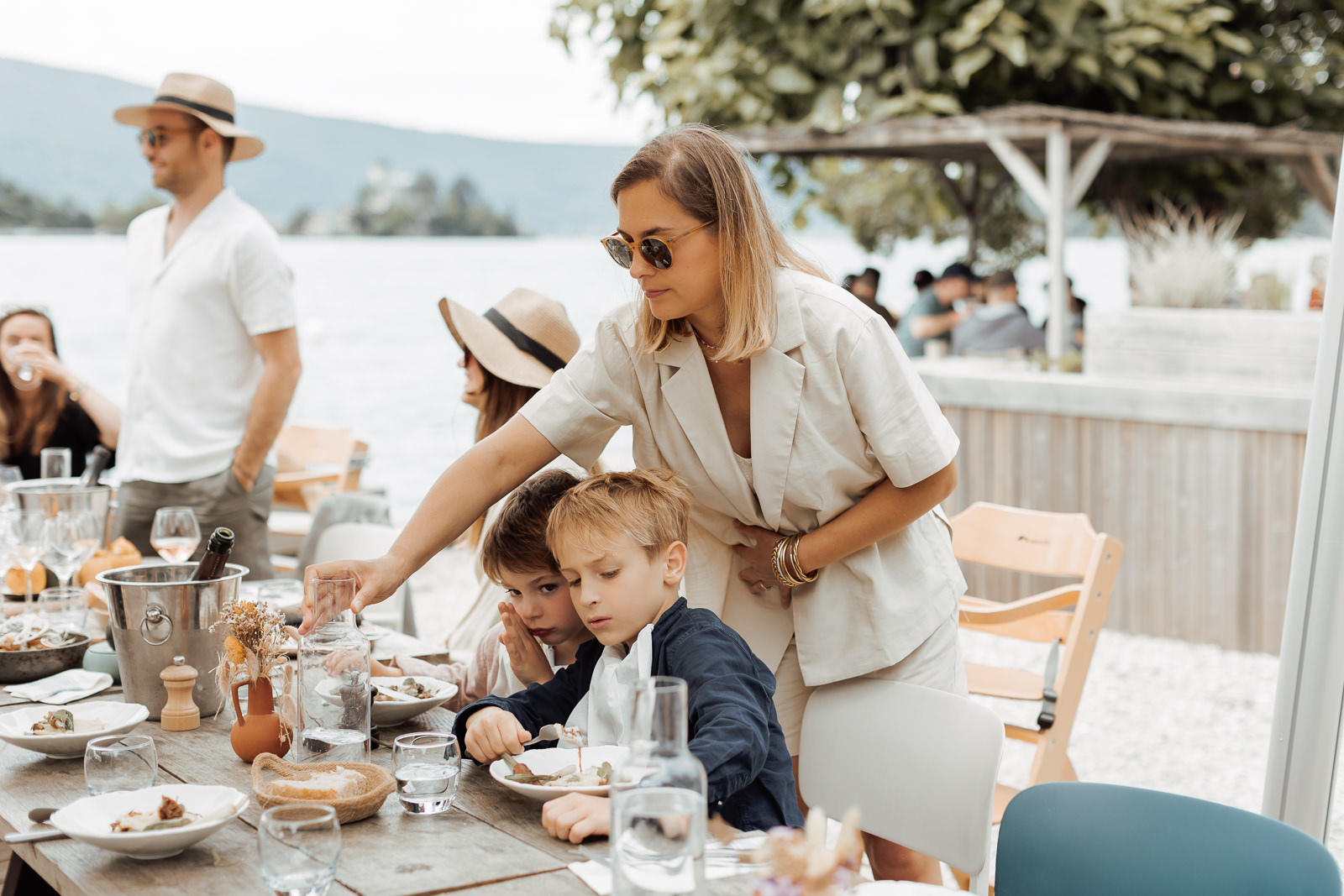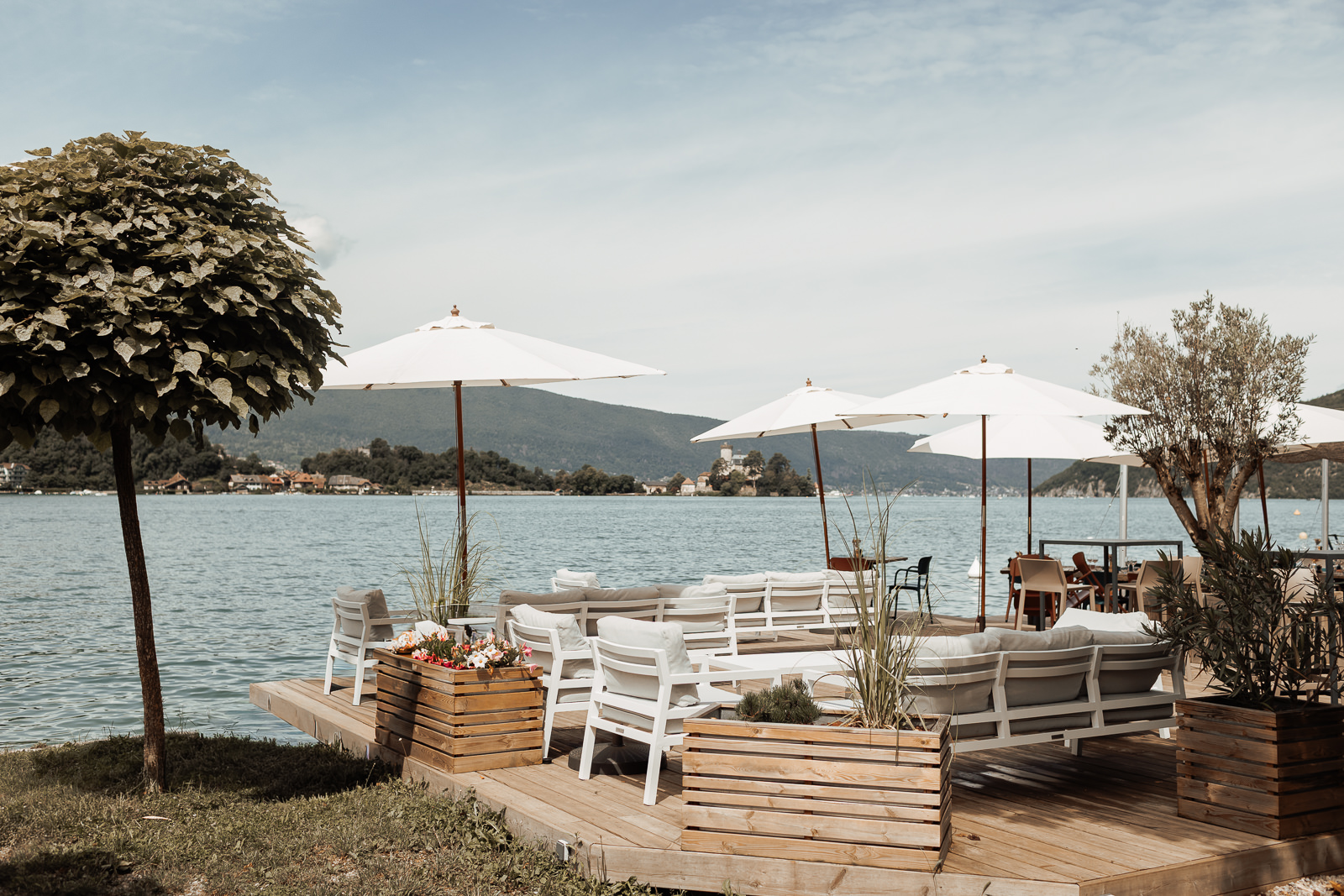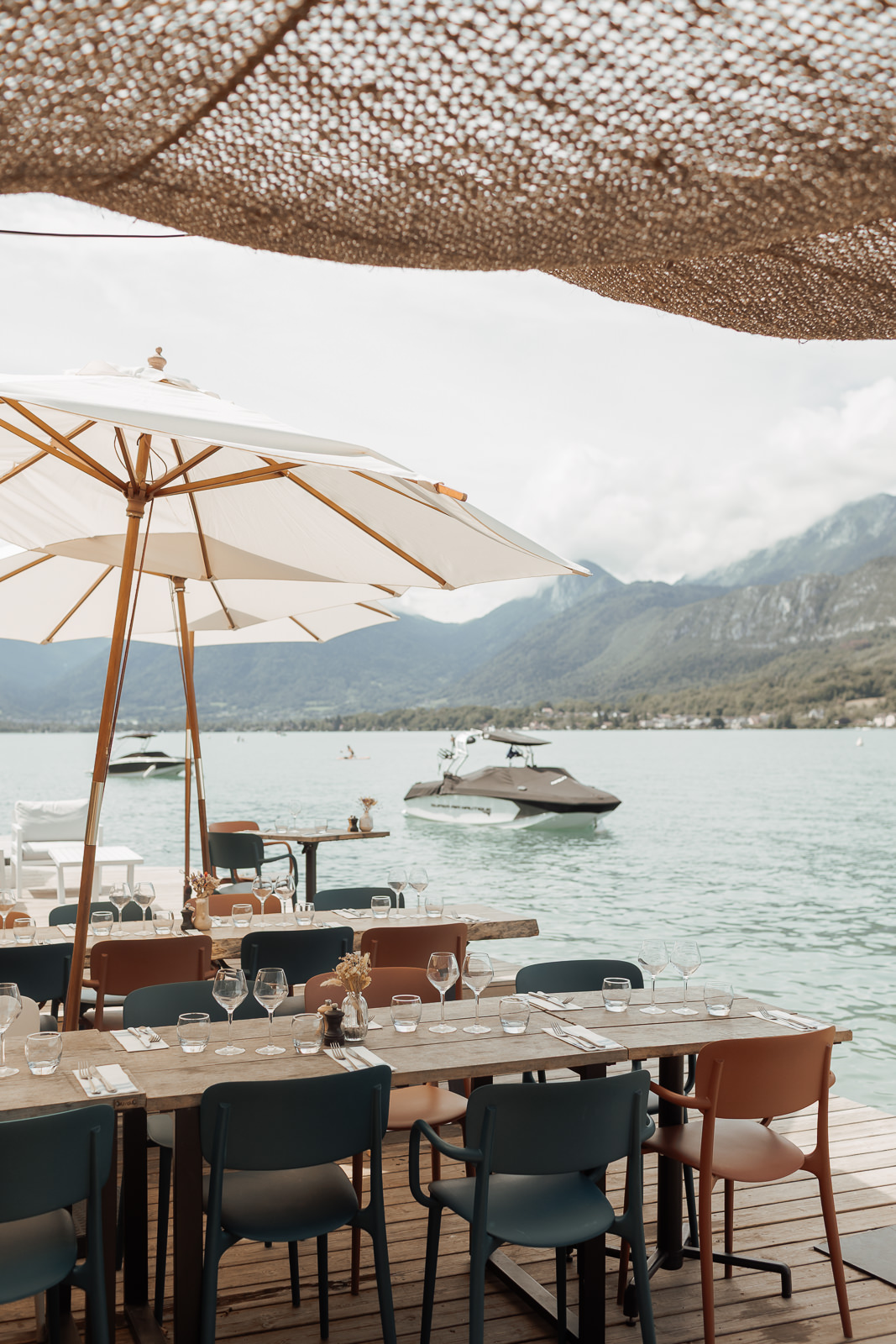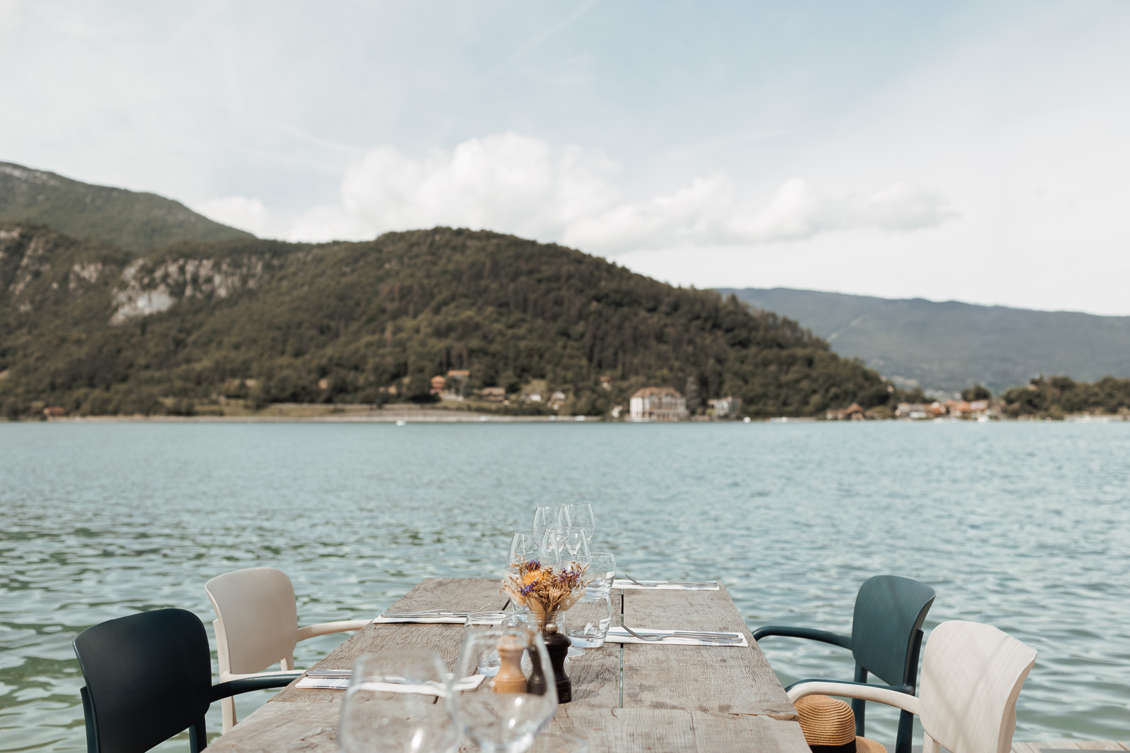 La lumière ce jour-là était intense et se reflétait sur le lac d’Annecy. Le restaurant Les Cassines permet d’avoir plusieurs points de vue différents : terrasse, bord de lac, montagnes en arrière-plan. Un terrain idéal pour un reportage naturel cohérent et lumineux.