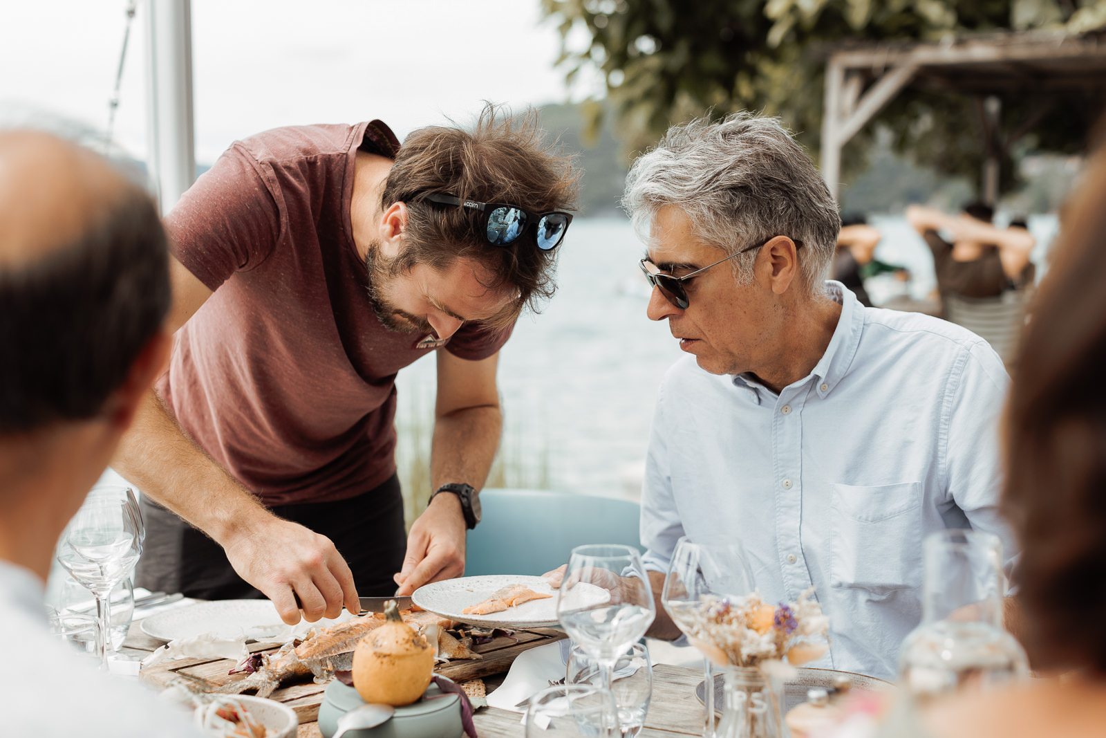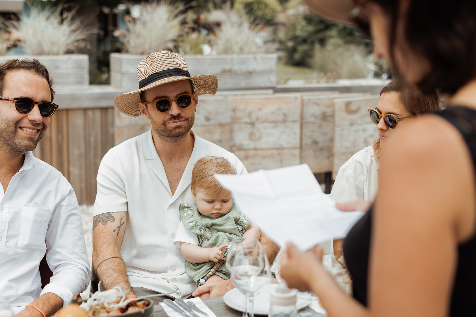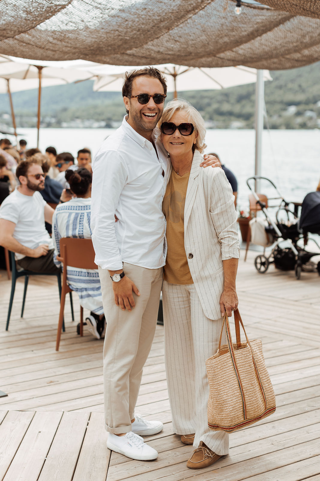 J’ai retrouvé la famille directement au restaurant pour commencer le reportage. Dès mon arrivée, l’ambiance était conviviale, douce et spontanée. Les enfants jouaient au bord de l’eau, les invités échangeaient autour des petits fauteuils, et chaque instant respirait la simplicité d’un rassemblement familial authentique.
